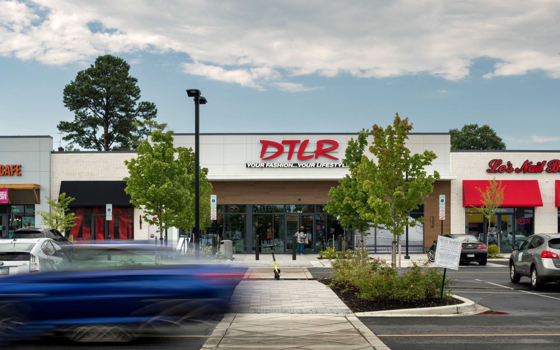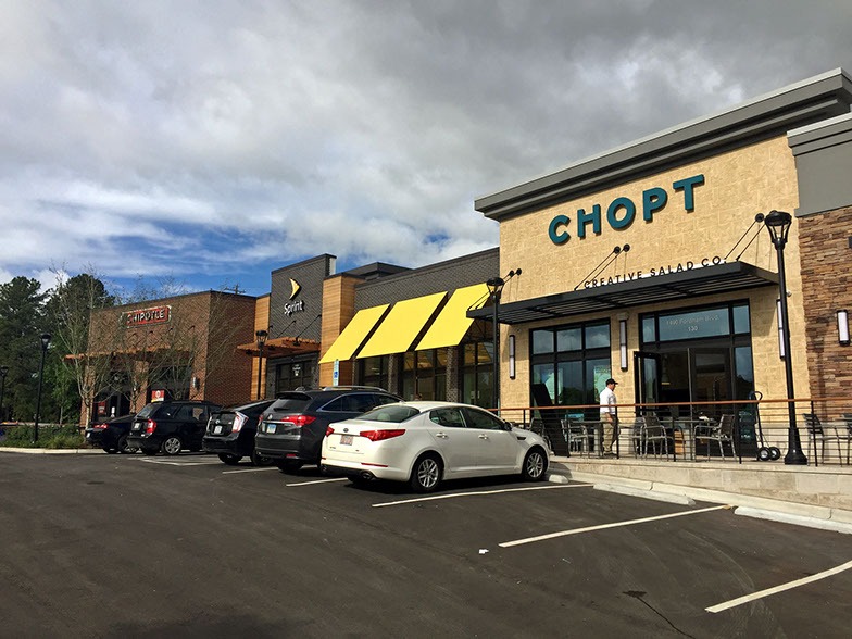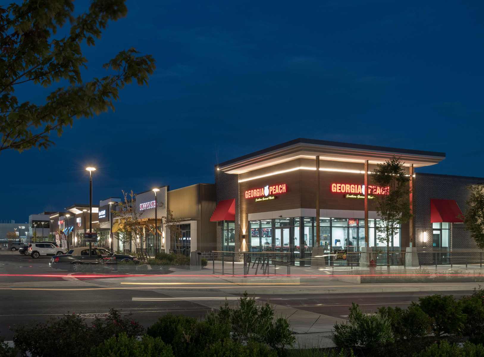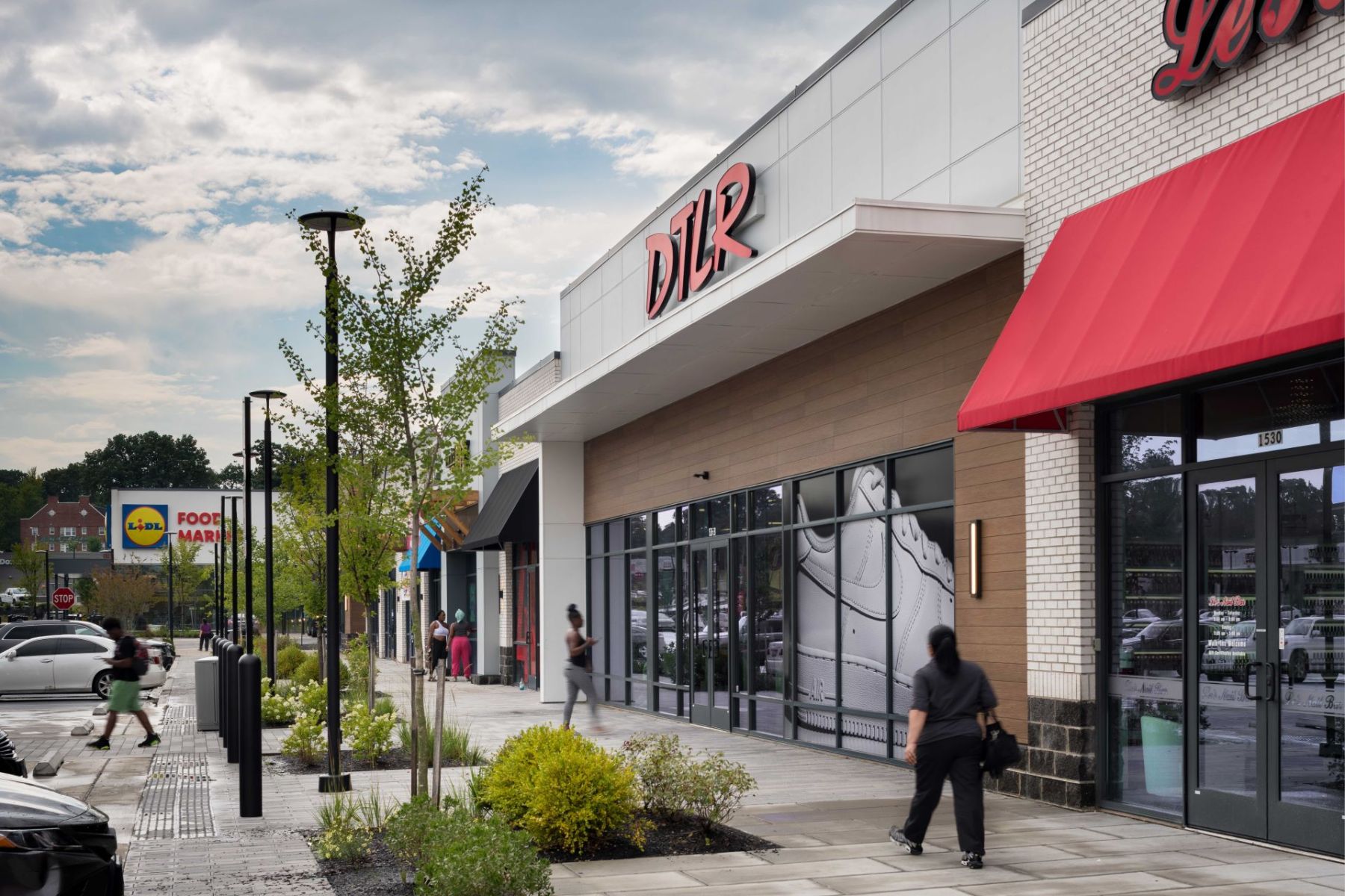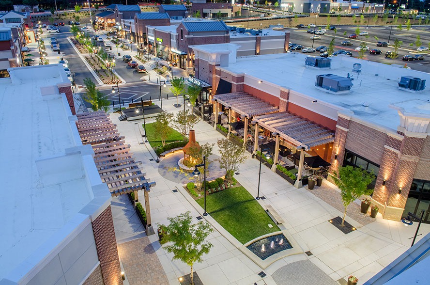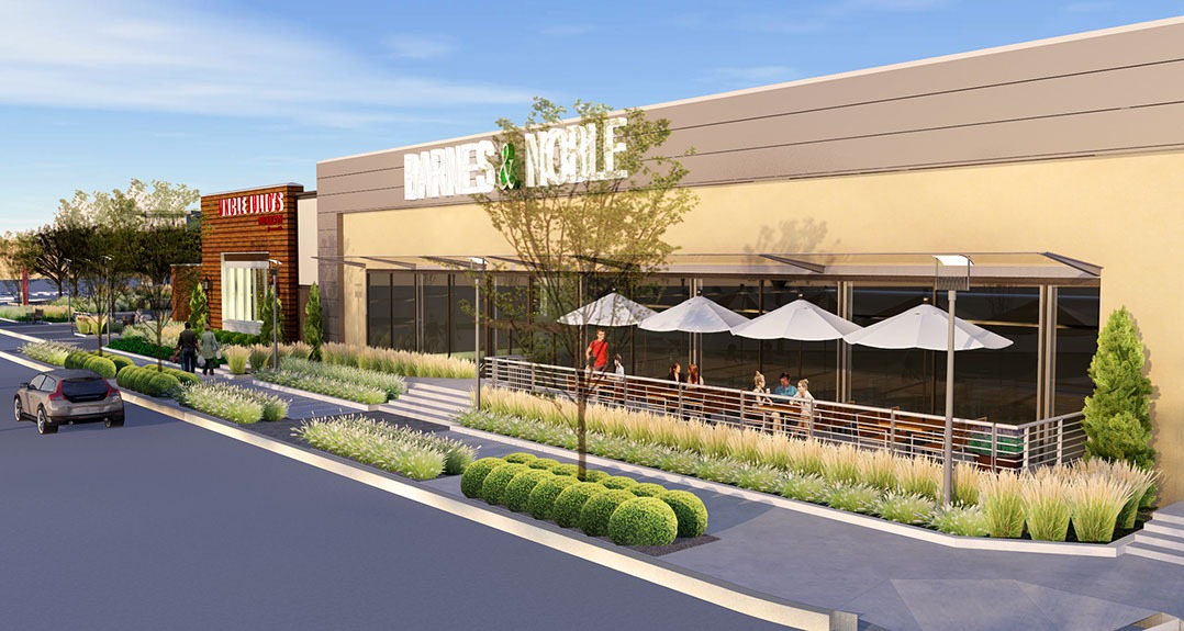 In addition to the conversion, JP2 designed two pad buildings with outdoor seating areas and terraces, enhancing walkability throughout the site and between lower and upper level tenants. The addition of fast casual restaurants contributes to the dining options within the center, complemented by lush landscaping and benches for a pleasant atmosphere.