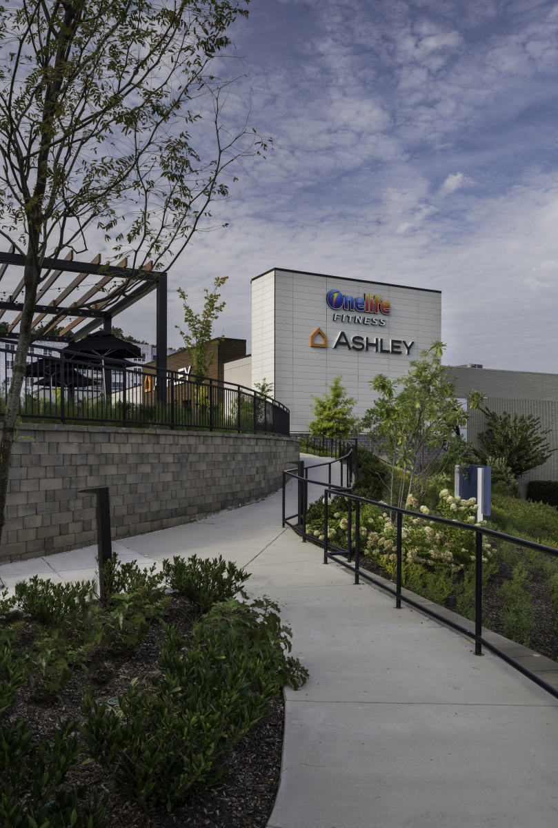 The Hunt Valley Towne Center is a mixed-use project located in Cockeysville, MD. JP2 designed the conversion of the existing vacant anchor building on the west side into a cohesive space featuring Onelife Fitness and Ashley's Furniture. The existing façade of the old Sears was removed to allow for the new tenant facades and addition for the Onelife Vestibule.