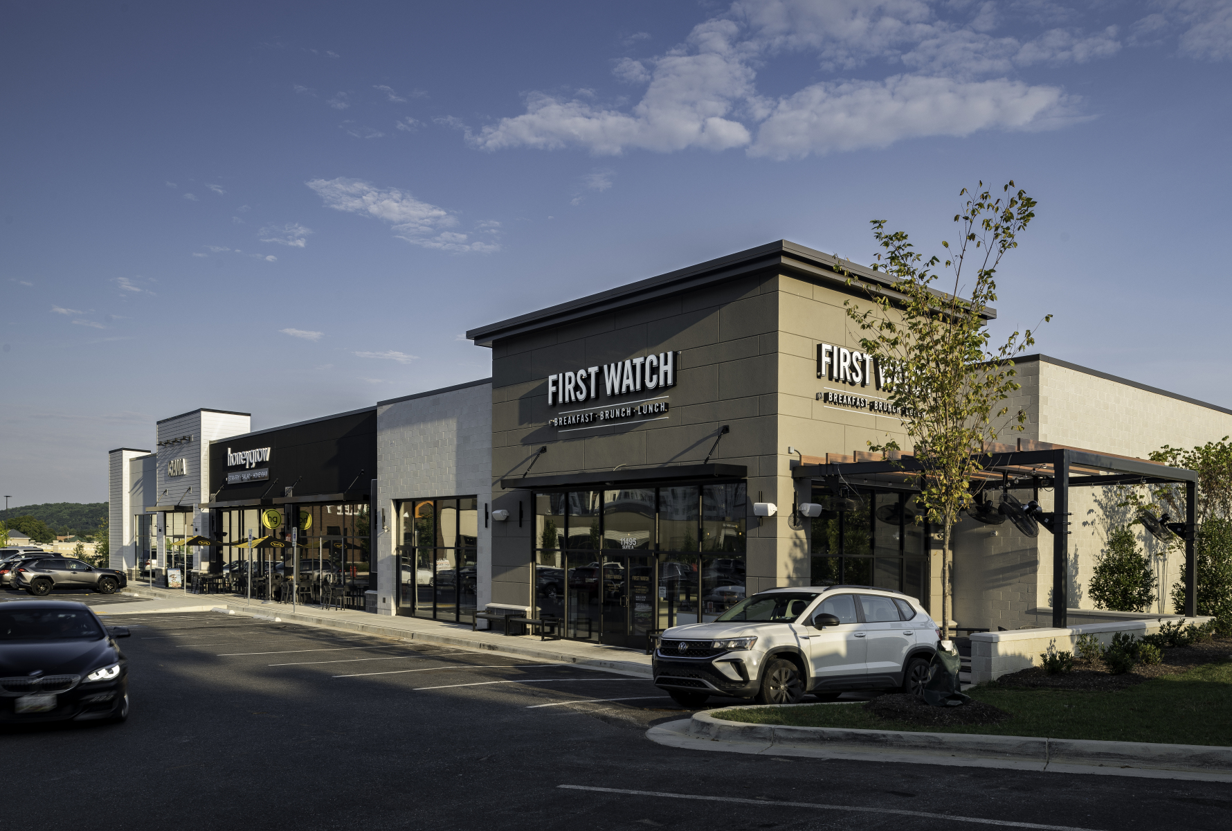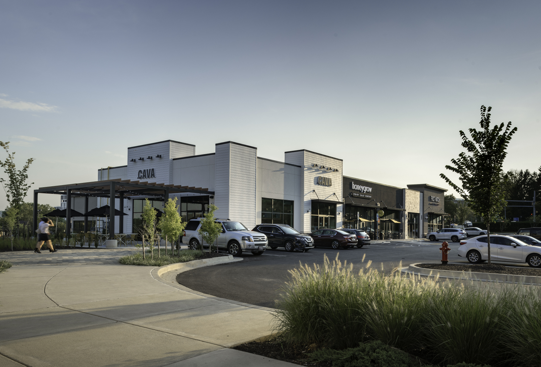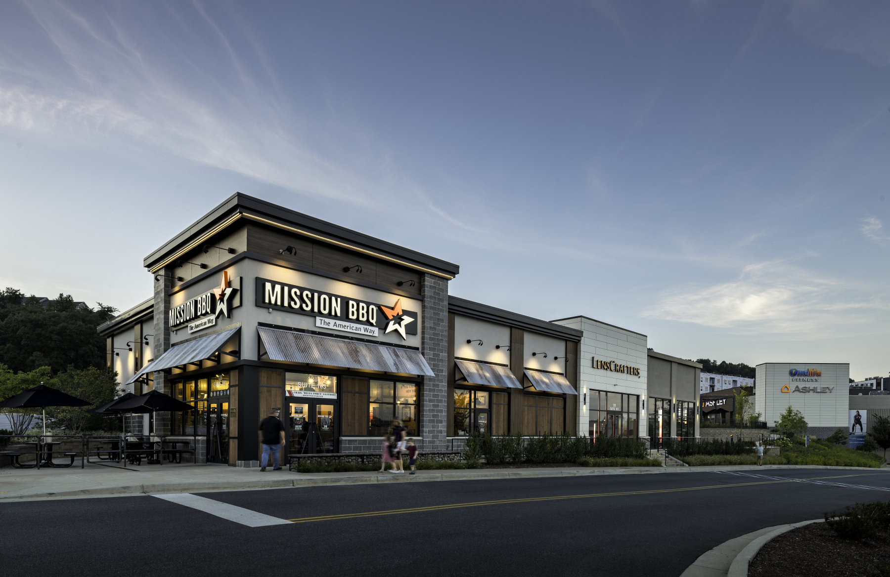 In addition to the conversion, JP2 designed two pad buildings with outdoor seating areas and terraces, enhancing walkability throughout the site and between lower and upper level tenants. The addition of fast casual restaurants contributes to the dining options within the center, complemented by lush landscaping and benches for a pleasant atmosphere.