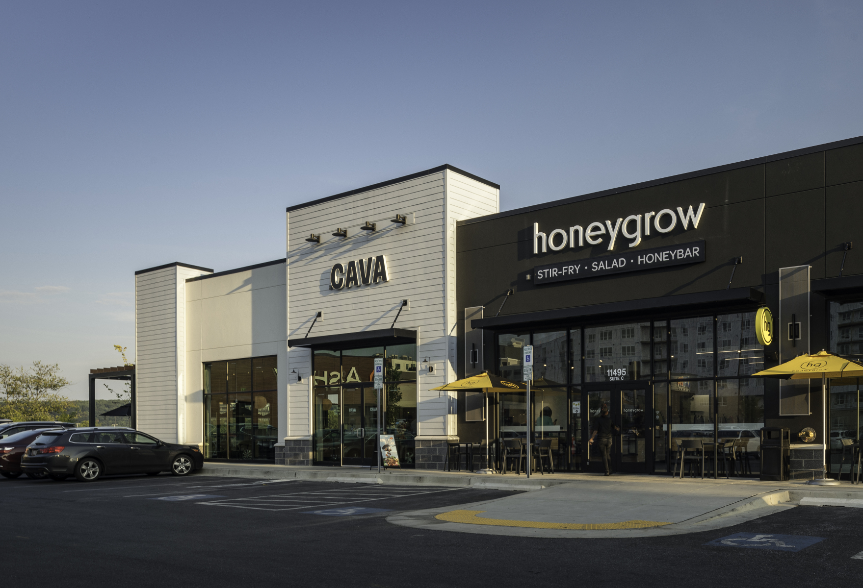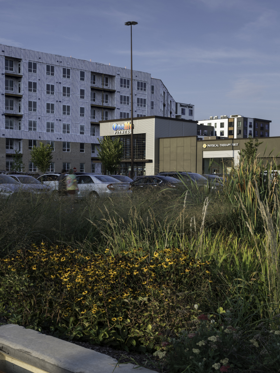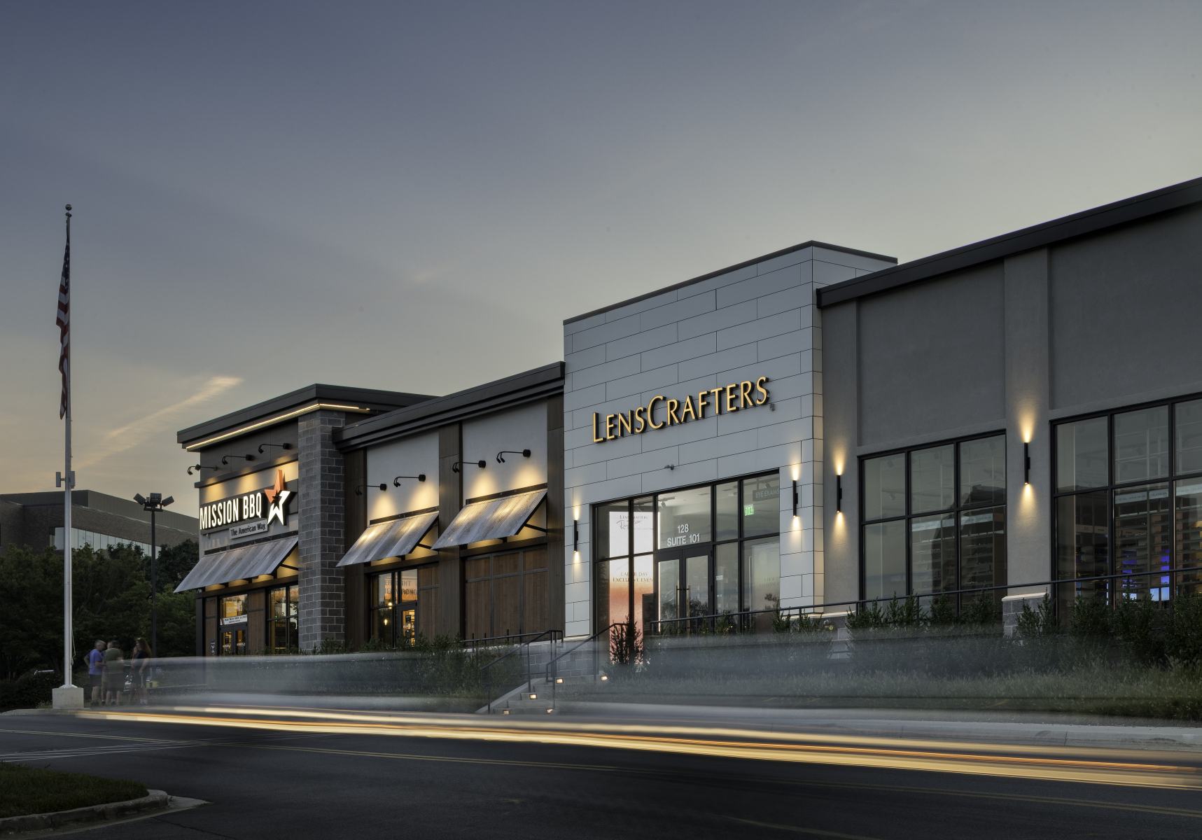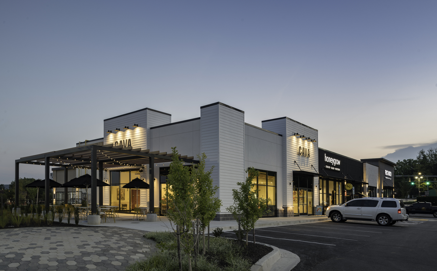 In addition to the conversion, JP2 designed two pad buildings with outdoor seating areas and terraces, enhancing walkability throughout the site and between lower and upper level tenants. The addition of fast casual restaurants contributes to the dining options within the center, complemented by lush landscaping and benches for a pleasant atmosphere.
